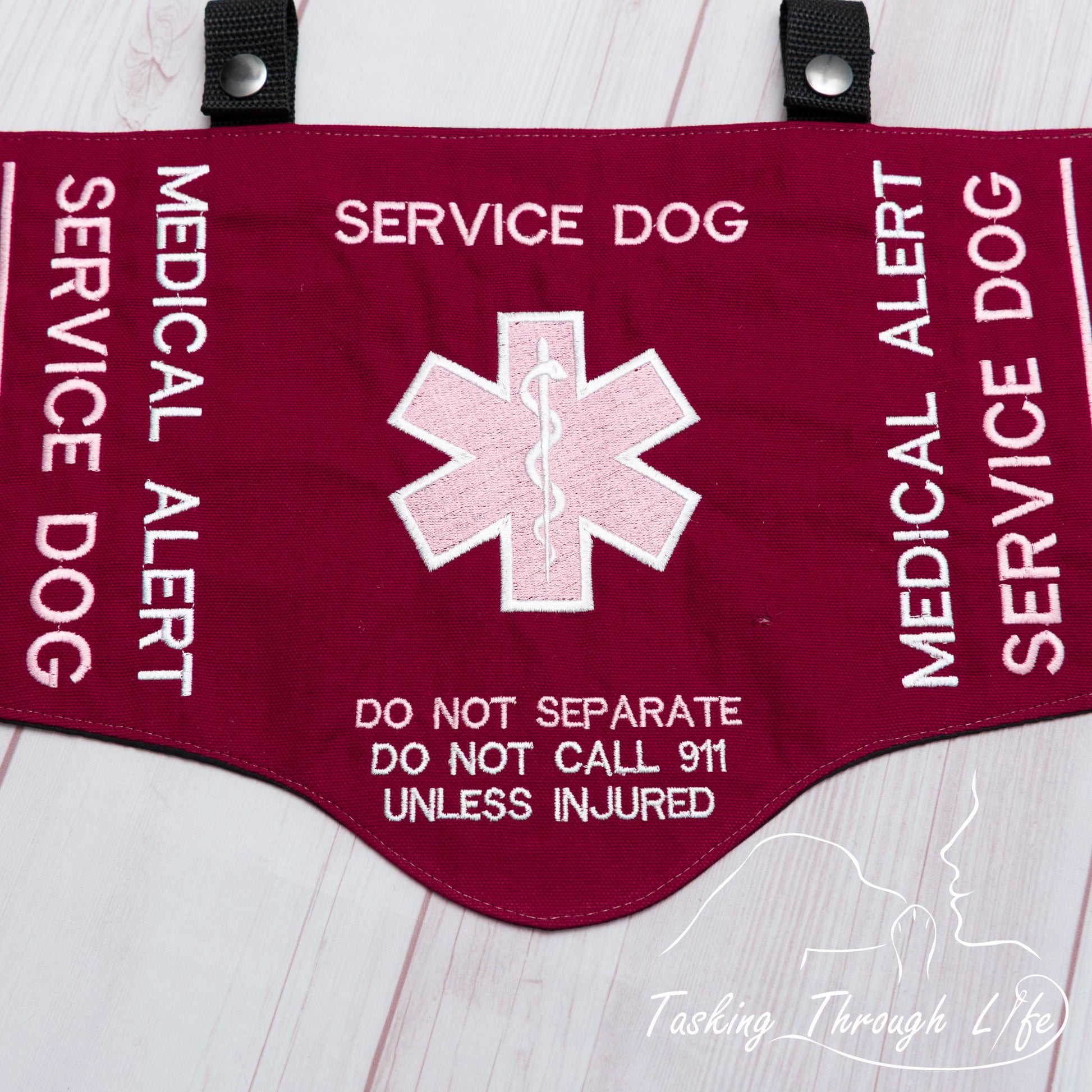 New Burgundy cotton canvas cape with white and pink text and standard 7" spaced harness straps. .